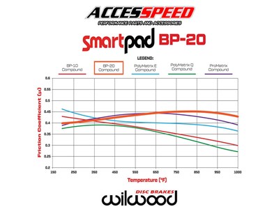Wilwood BP compound SmartPad numbered series represents the latest compounds developed through Wilwood research. Used by top racers in all auto racing genres, they also come standard in most kits for street use. Four different formulas offer increasingly aggressive friction and tolerance to high temperature, from spirited street use to extremely demanding racing competition. Multiple friction options allow users to optimize brake response to track conditions and weather. Compatible with all iron, steel, stainless, and titanium rotors within their intended temperature ranges.