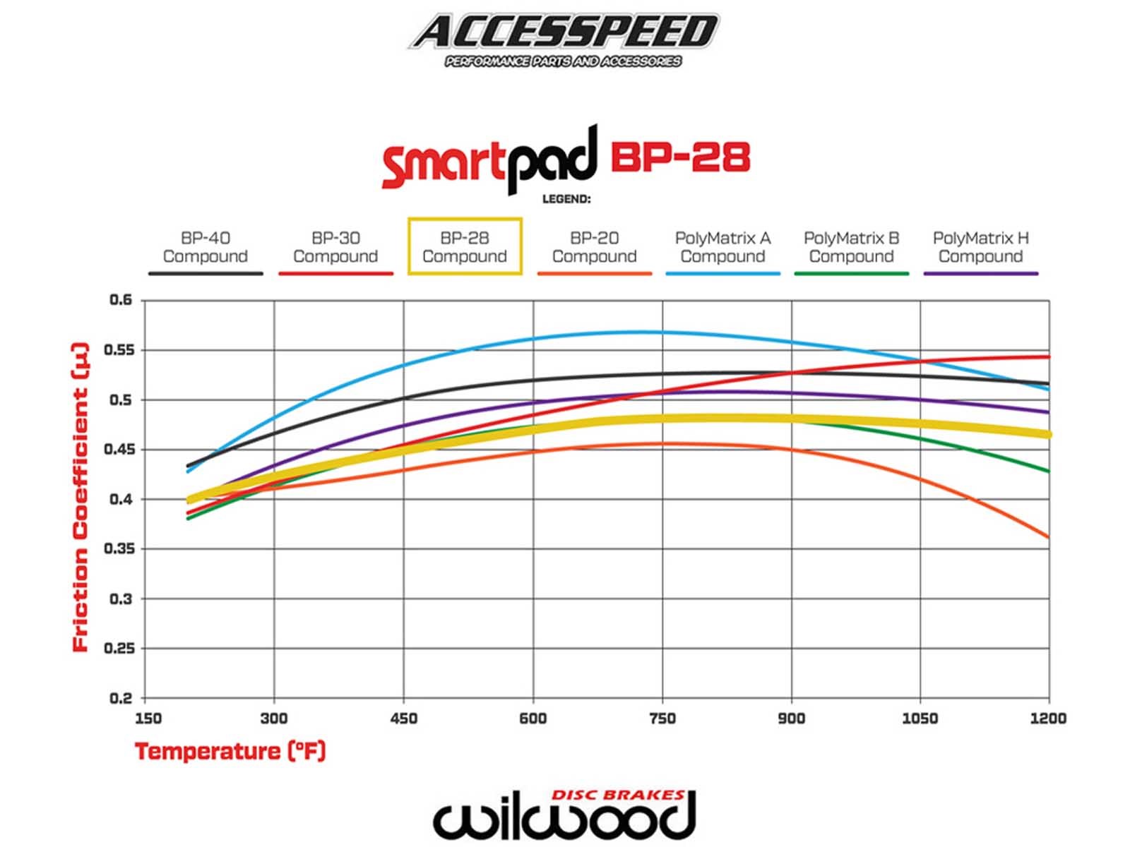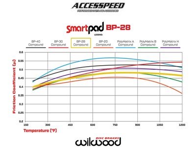 Wilwood BP compound SmartPad numbered series represents the latest compounds developed through Wilwood research. Used by top racers in all auto racing genres, they also come standard in most kits for street use. Four different formulas offer increasingly aggressive friction and tolerance to high temperature, from spirited street use to extremely demanding racing competition. Multiple friction options allow users to optimize brake response to track conditions and weather. Compatible with all iron, steel, stainless, and titanium rotors within their intended temperature ranges.