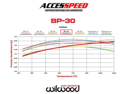 The Wilwood BP-30 brake pad compound is engineered for high friction and fade resistance with long wear in endurance-type competition. This compound is well-suited for road racing, hard braking short track oval racing, or any type of competition with sustained high temperatures. BP-30 SmartPads provide smooth initial engagement with linear response through the entire temperature range. These brake pads are now available in the pad plates used with popular Wilwood racing calipers including D52 GM (full size), D154 GM (metric), and other caliper brands using common pad plate shapes.