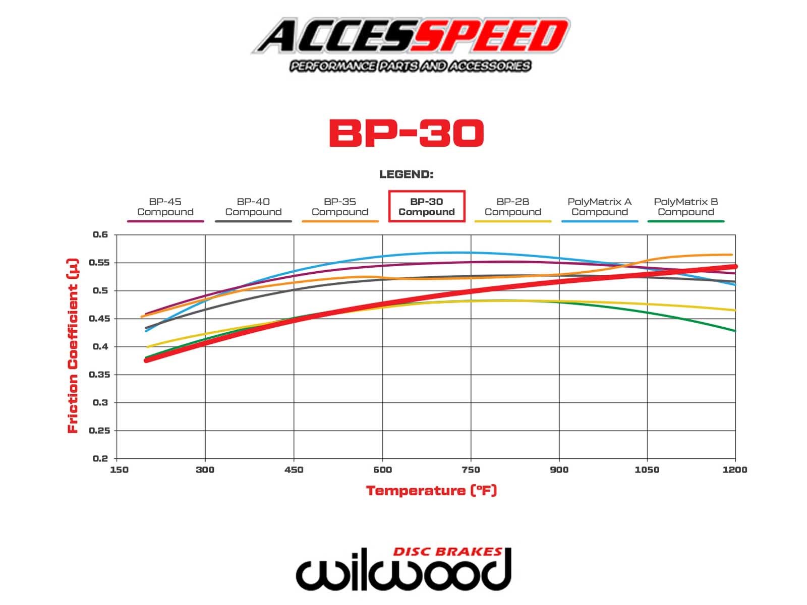 The Wilwood BP-30 brake pad compound is engineered for high friction and fade resistance with long wear in endurance-type competition. This compound is well-suited for road racing, hard braking short track oval racing, or any type of competition with sustained high temperatures. BP-30 SmartPads provide smooth initial engagement with linear response through the entire temperature range. These brake pads are now available in the pad plates used with popular Wilwood racing calipers including D52 GM (full size), D154 GM (metric), and other caliper brands using common pad plate shapes.