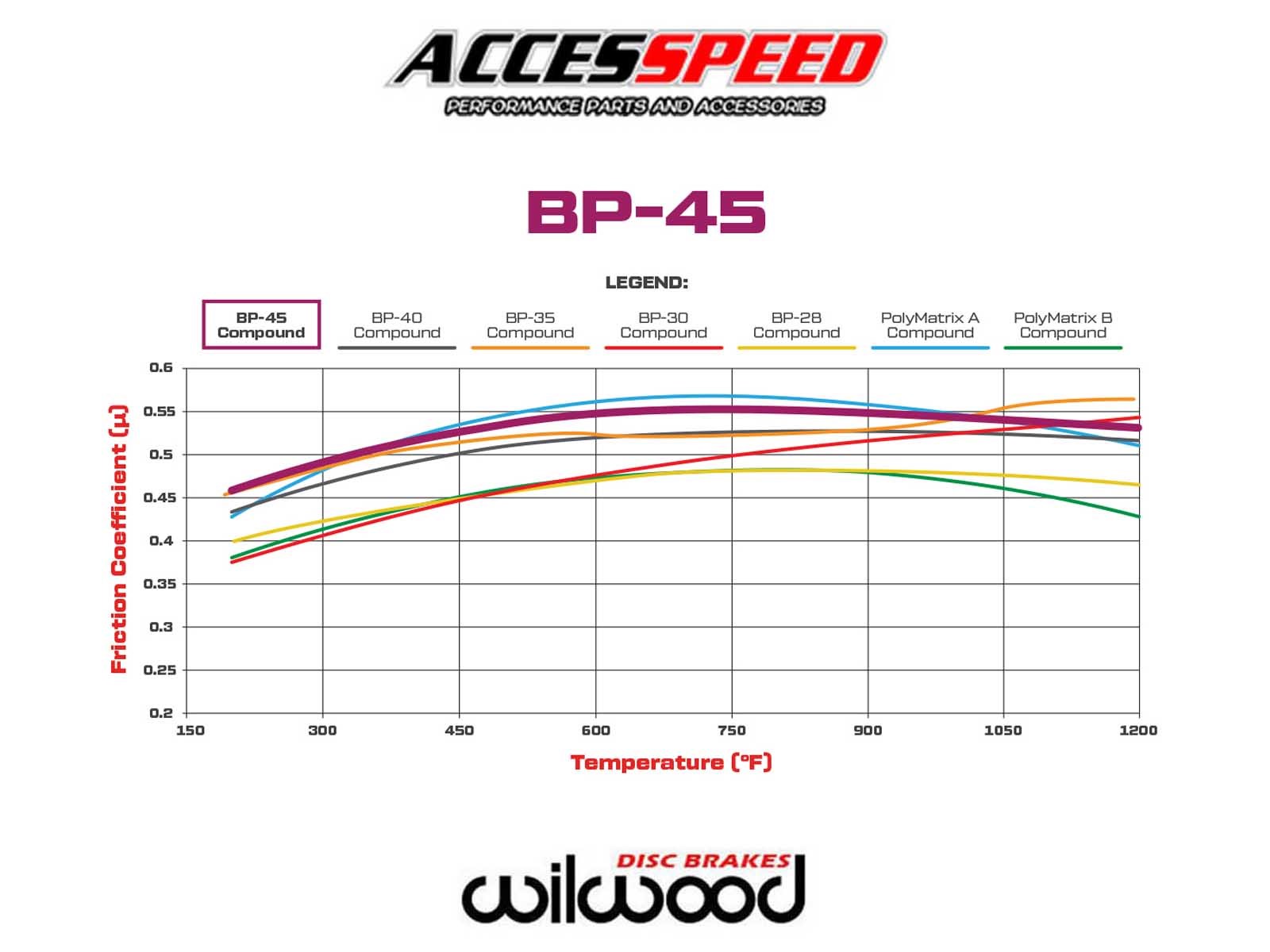 Wilwood BP compound SmartPad series represents the latest compounds developed through Wilwood research. Used by top racers in all auto racing genres, they also come standard in most kits for street use. Four different formulas offer increasingly aggressive friction and tolerance to high temperature, from spirited street use to extremely demanding racing competition. Multiple friction options allow users to optimize brake response to track conditions and weather. Compatible with all iron, steel, stainless, and titanium rotors within their intended temperature ranges. Wilwood’s latest compound, the BP-45, is a very high friction pad formulated to provide smooth friction throughout the entire temperature curve with high torque control, providing drivers with a consistent and accurate pedal feel during heat cycles. For use on iron or steel rotors in all types of race vehicles.