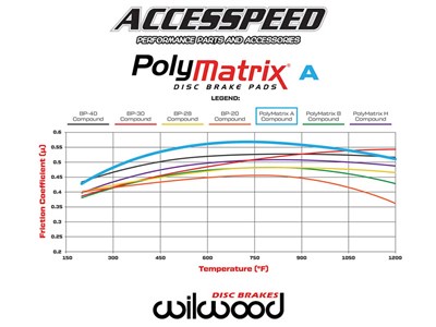Wilwood PolyMatrix A-Compound racing brake pads offer unique characteristics, including an ultimate high-friction compound with immediate low-temperature response and medium-to-low wear rate during sustained high heat braking. The A-Compound is a race-only pad with a very aggressive initial response and high heat fade resistance. Pad applications include road course, oval pavement, and all classes of dirt track racing. Beds quickly and provides fast response without excessive abrasion on iron or steel rotors.