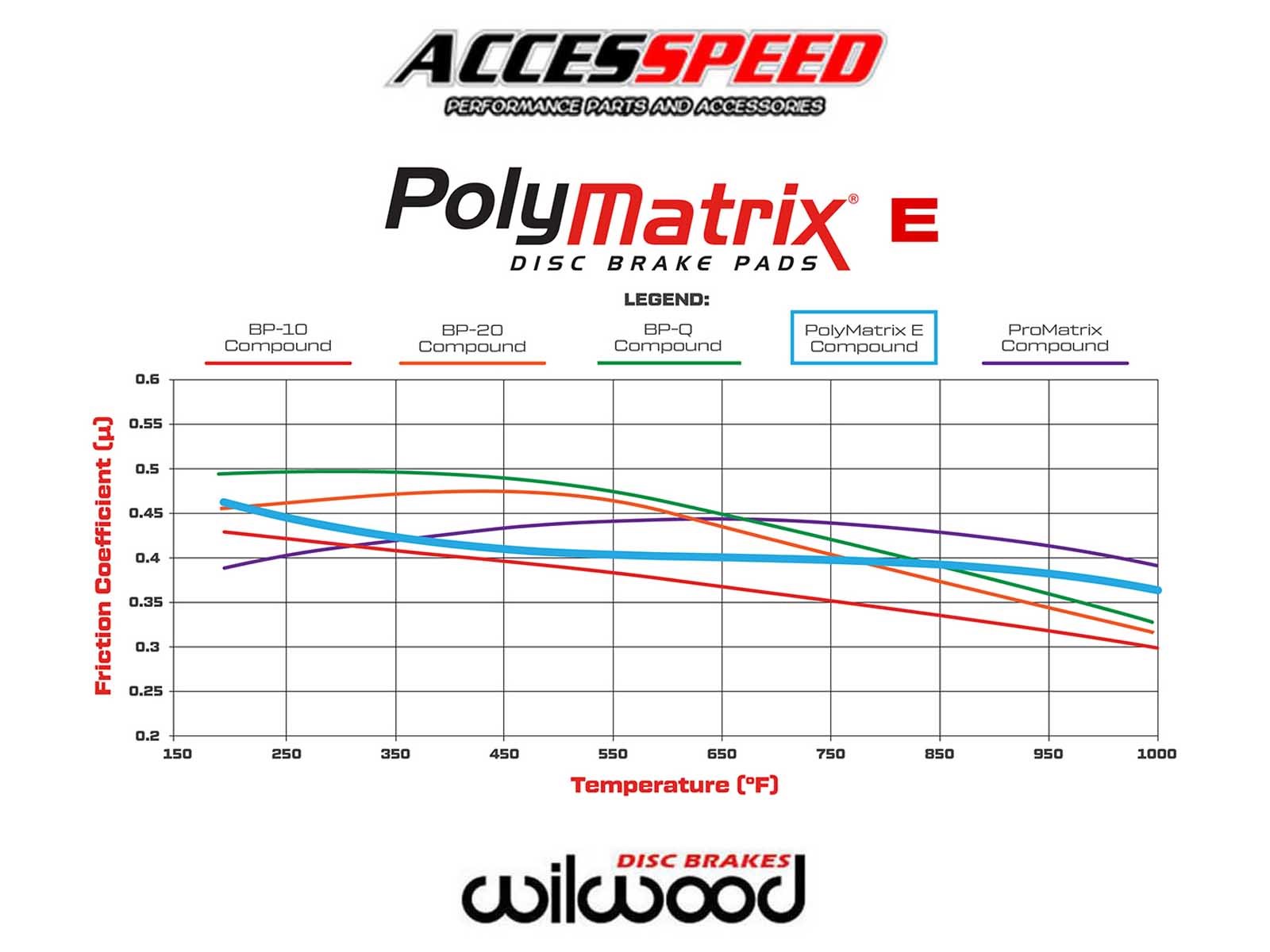 Wilwood PolyMatrix E-Compound brake pads offer unique characteristics, including a medium friction compound with the highest effective range in the medium temperature pad group. Smooth engagement with consistent response from a flat torque curve throughout its entire effective range. Best overall wear properties in the medium temperature pad group. Beds quickly and provides fast response without excessive abrasion on iron or steel rotors.