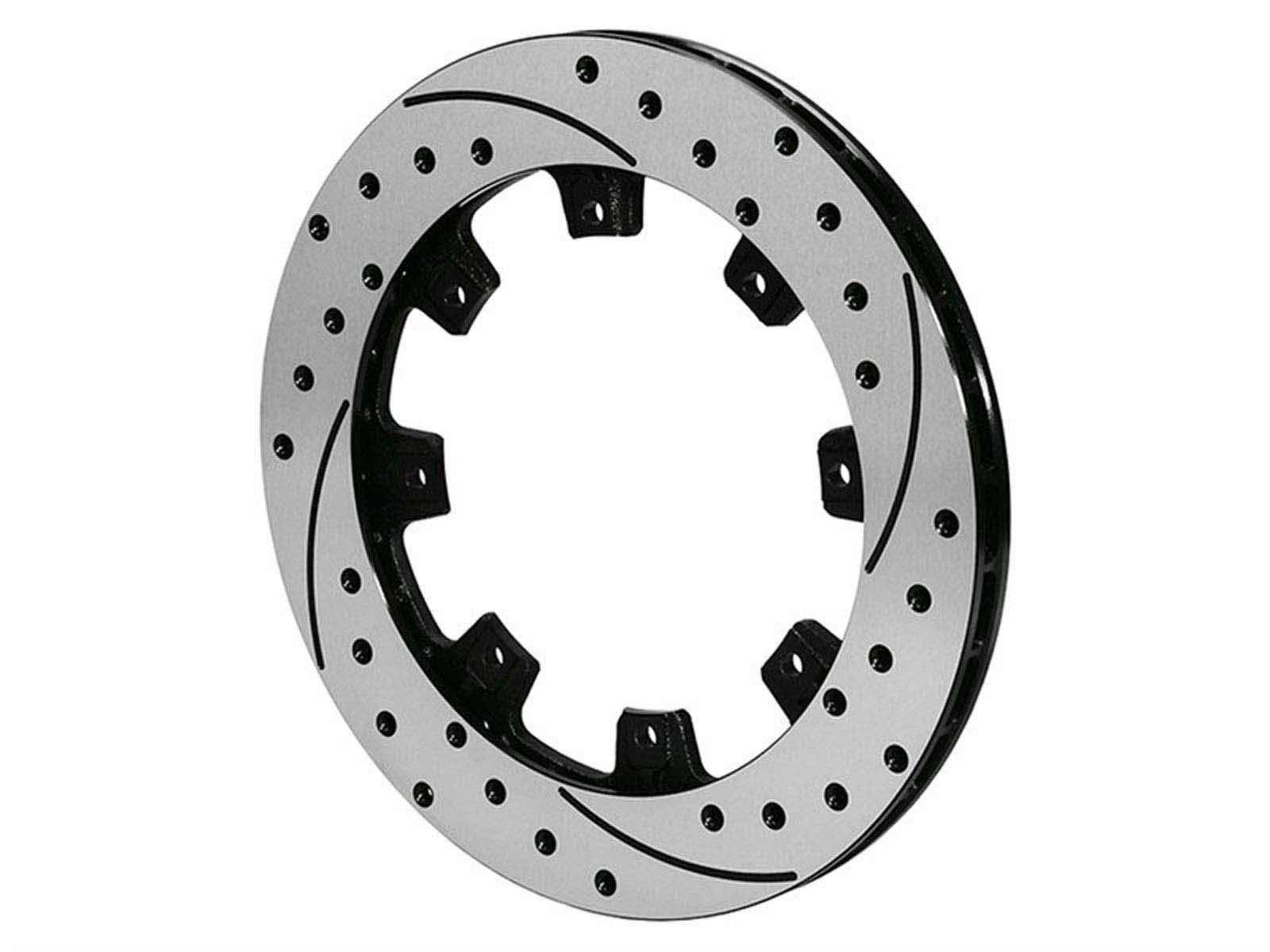 Wilwood SRP Drilled Performance Rotors feature a specially engineered directional cross drill and face slot pattern that improve brake response and pad performance throughout the entire range of light to heavy braking. The venting and cleaning action of the holes and slots will reduce pad glaze and disperse gasses and heat generated during the pad to rotor interface. The holes and slots also inhibit irregular pad compound build-up on the rotor faces resulting in smoother engagement and improved pedal response in all conditions. The material removed also contributes to lower rotating and unsprung suspension weight.