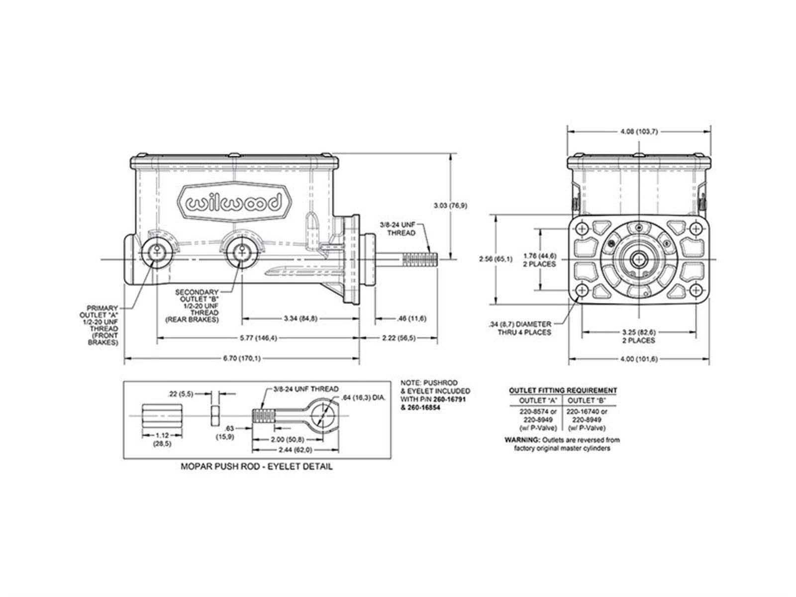 Wilwood now makes a performance master cylinder with a flange specifically for Mopar's unique four bolt pattern. The rectangular mounting flange of our Mopar Compact Tandem master cylinder matches the A-body, B-body and the E-body firewall mounts in the 1960's and 70's. Available in 15/16", 1.00" and 1-1/8" bore sizes without pushrod, 15/16" and 1.00 with pushrod and Mopar style eyelet. Available in either a chrome powder coat finish or a glossy black E-coat to complement any engine bay. Optional kits are available that include a combination valve with a hydraulic brake light switch, adjustable proportioning valve, bracket, and plumbing.