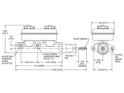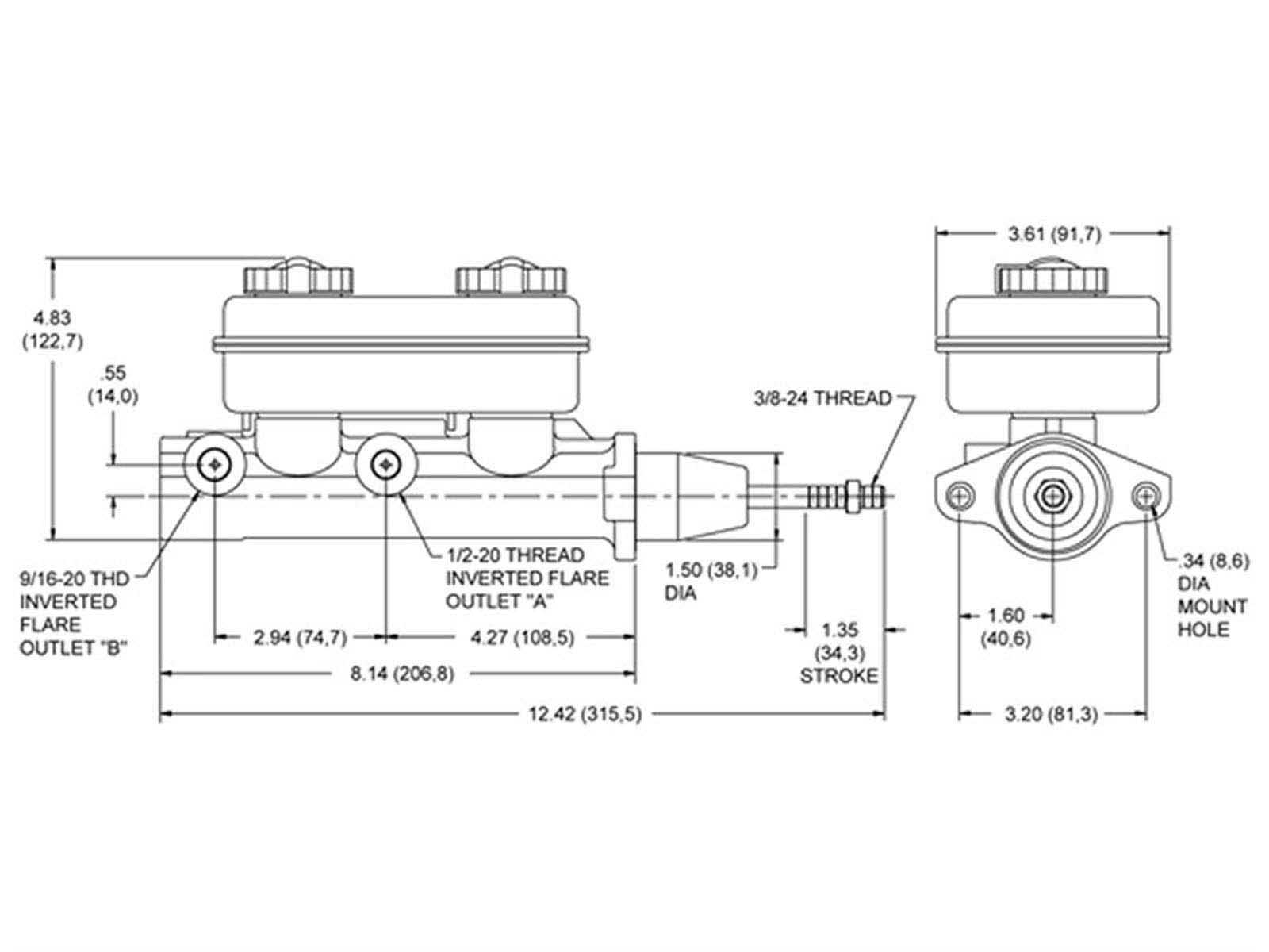 Made from durable lightweight aluminum with a large capacity plastic reservoir and dual outlet bores, this Wilwood master cylinder utilizes standard O.E.M. internal components. Standard factory mounting bolt holes can be adapted to racing pedal assemblies with an optional mounting adapter bracket (including push rod and dust boot, see diagram below). This lightweight (2.5 pounds) reliable master cylinder is used for Drag Racing, Late Model Stock Cars, Street Rod and Off Road applications.