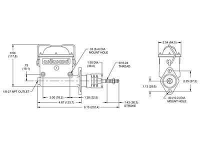 Wilwood High-Volume Aluminum Master feature high pressure die-cast bodies from high-grade aluminum. Wilwood. High-Volume Master Cylinders have the highest fluid capacity of any integral reservoir design. With a total capacity of 8.2 ounces, there is at least 26% more fluid volume than other brands. With 1-7/16" of piston travel, it offers extra margin when used with large piston calipers. Heavy duty internal springs provide fast retraction. Formed steel lids with bellows type gaskets keep the moisture out. Wilwood master cylinders use common dimensions for flange or side mounting and a 1/8-27 NPT outlet port.