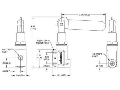 Wilwood's new generation of adjustable proportioning valves combines the latest refinements to deliver precise pressure metering and strength from a compact forged billet design. Pressure adjustments range from 150-1200 PSI and provide for a maximum decrease of 57% in line pressure, the most of any available valve. This proportioning valve has six preset points actuated by moving a lever allowing racers to quickly adjust brake bias during a race. The lever "clicks" into the six positions for positive adjustment. Valves weigh only 6.1 ounces (lever), and have two .25" side mounting holes spaced 1.00" apart. Inlet / outlet ports are 1/8-27 NPT and valves are supplied with two 1/8-27 NPT to 3/8-24 inverted flare female fittings that will fit most domestic 3/16th hard brake lines.