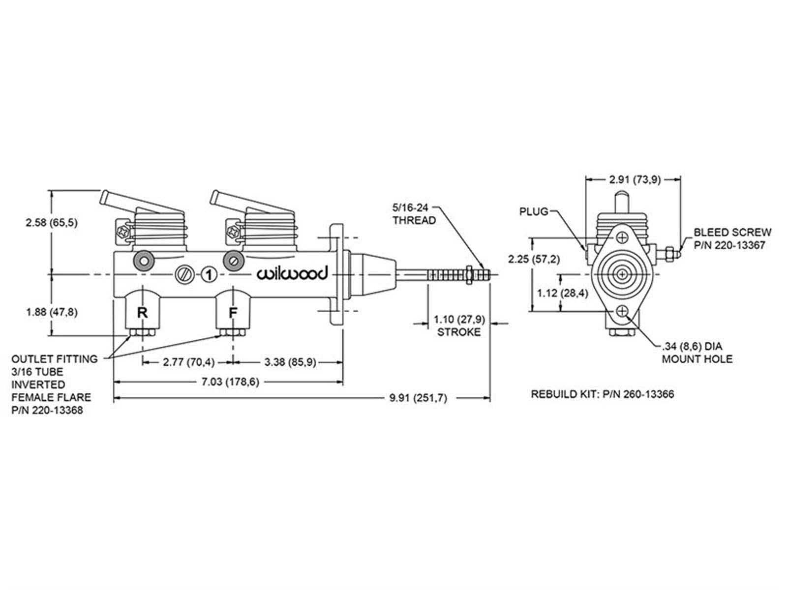 Wilwood’s Remote Tandem master cylinders provide one of the safest ways to actuate four wheel or dual caliper axle brake systems. The cylinder features 50/50 output from a 1.00" bore with 1.10" stroke. This master cylinder can be bolted directly to Wilwood's single mount pedals. The kit is shipped complete with the master cylinder, 4 ounce reservoirs, remote brackets and 3.38" x 5/16-24 pushrod. Reservoirs can be direct mounted or remote mounted using the include bracket assemblies. 260-7563 also includes 2 additional 3/8" x 30" fluid resistant hoses for remote mounting.