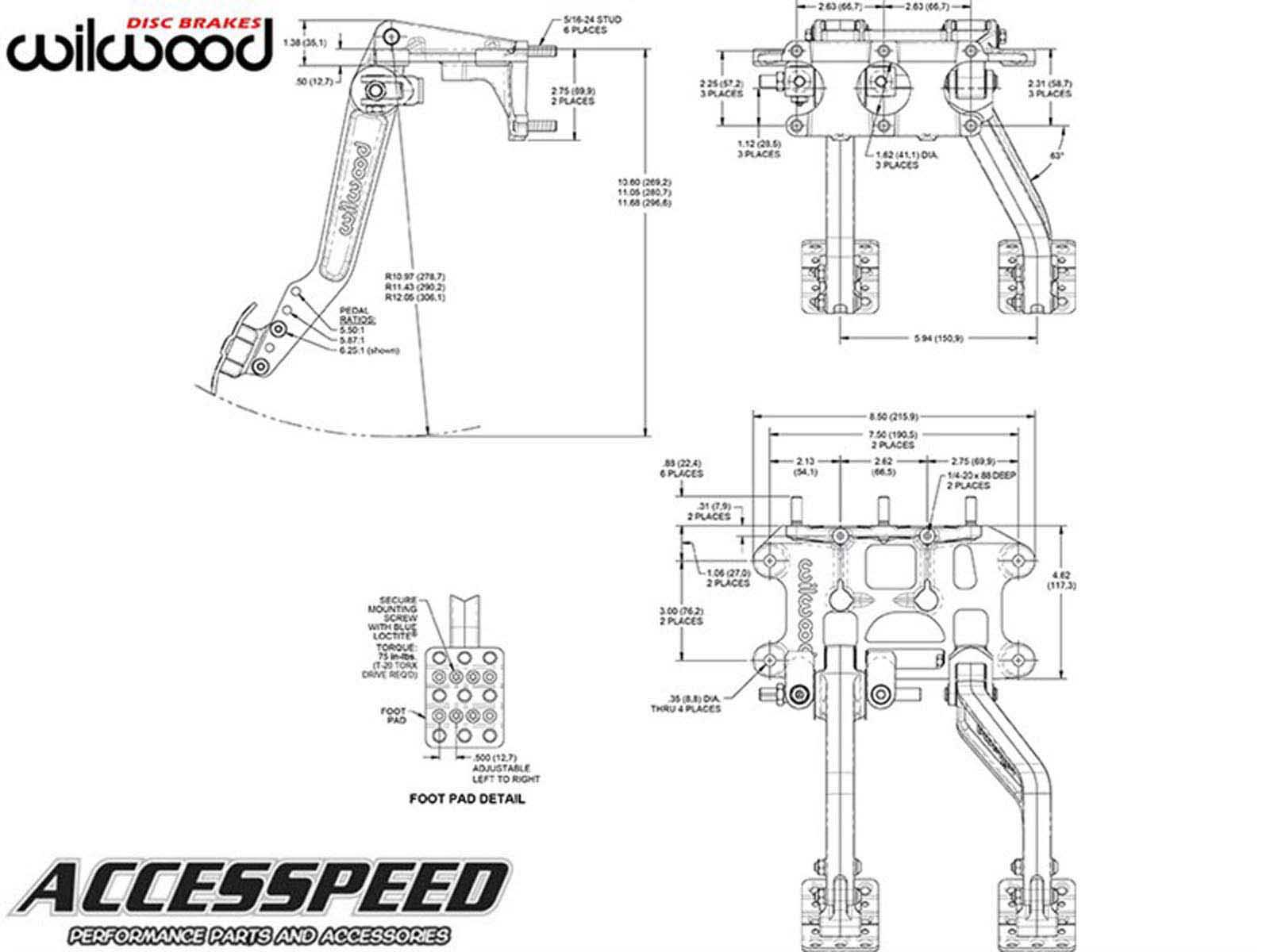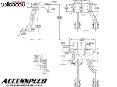 This is the Wilwood adjustable ratio balance bar brake pedal with offset clutch pedal from Accesspeed, in a forward swing hanging assembly. Pedal head adjusts vertically to provide a 5.50, 5.88, or 6.25:1 ratio for more feel or less pedal effort. A clutch master cylinder and two brake master cylinders mount to the assembly through the firewall, with an adjustable balance bar providing front to rear brake bias fine tuning. The non-skid waffled pedal pads can be laterally adjusted to be from 5” to 7” on center for driver preference. The pedals feature a lightweight aluminum frame, with high strength reinforced I-beam style forged pedal arms. The balance bar incorporates a positive detent stop every full turn to maintain adjustment position and can be locked in place with the included jam nut, or used with an optional remote knob, which is an Accesspeed favorite for quick on-track adjustments. A pin and clevis pushrod attachment system ensures the smallest possible misalignment angle for bind free operation through the entire range of travel. This pedal accepts any three Wilwood 2.25-inch vertical mount flange single outlet master cylinders, available separately in a variety of styles and bore sizes.