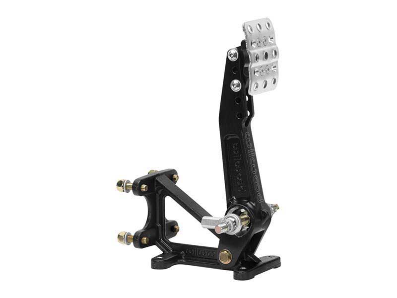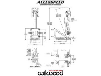 Wilwood adjustable ratio Tru-Bar single brake pedal from Accesspeed is available in a floor mount assembly. Pedal head adjusts vertically to provide a 5.25, 5.63, or 6.00:1 ratio for more feel or less pedal effort. Two brake master cylinders mount to the assembly, with a friction-free, trunnion based adjustable Tru-Bar balance bar providing front to rear brake bias fine tuning. The non-skid waffled pedal pad can be laterally adjusted 1/2 inch in either direction for driver preference.The pedal features a lightweight aluminum frame, with high strength reinforced I-beam style forged pedal arm. The Tru-Bar incorporates a positive detent stop every full turn to maintain adjustment position and can be locked in place with the included jam nut, or used with an optional remote knob, which is an Accesspeed customer favorite for quick on-track adjustments. Tru-Bar pedals utilize a fixed trunnion bearing in the pedal arm, with spherical rod-end bearing pushrod attachments reducing compliance and friction for more accurate brake feel. Tru-Bar pedals utilize the same chassis and master cylinder mounting as Wilwood balance bar style pedals. This pedal accepts two Wilwood 2.25-inch vertical mount flange single outlet master cylinders, available separately in a variety of styles and bore sizes from Accesspeed.