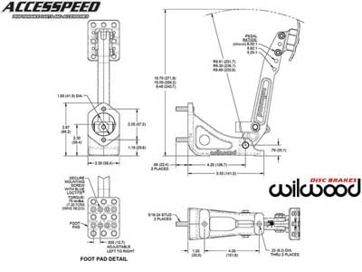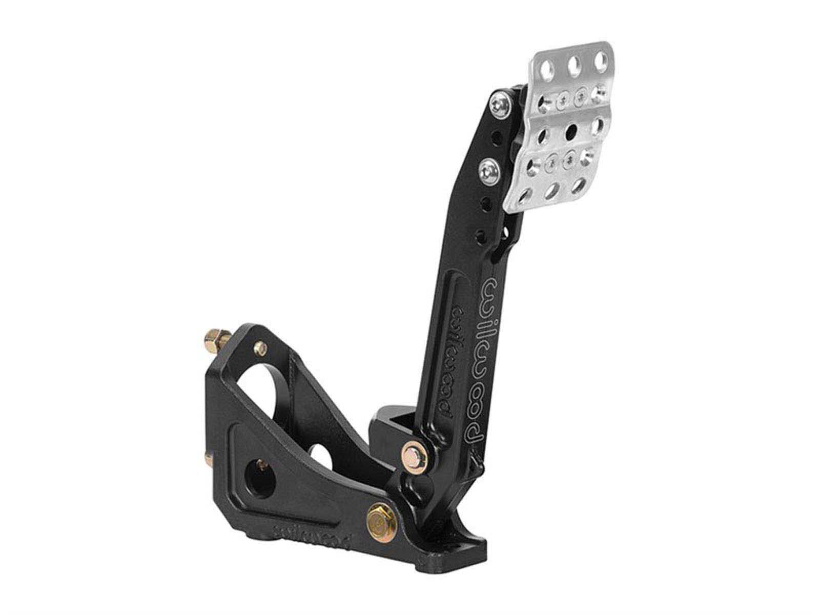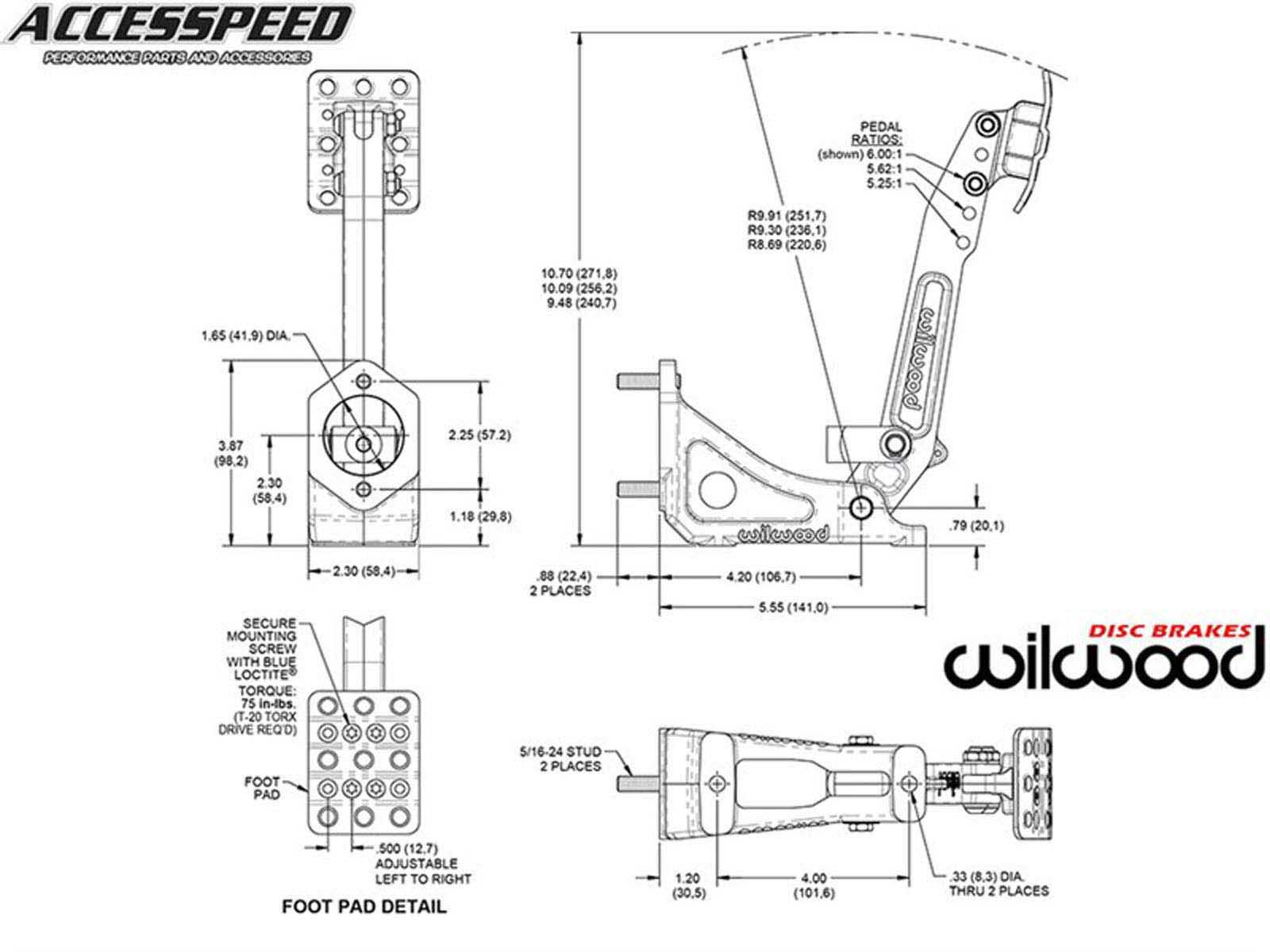 Wilwood adjustable ratio single clutch pedal from Accesspeed is available in a floor mount assembly. Pedal head adjusts vertically to provide a 5.25, 5.63, or 6.00:1 ratio for more feel or less pedal effort. The non-skid waffled pedal pad can be laterally adjusted 1/2 inch in either direction for driver preference. The pedal features a lightweight aluminum frame, with high strength reinforced I-beam style forged pedal arm. A pin and clevis pushrod attachment system ensures the smallest possible misalignment angle for bind free operation through the entire range of travel. This pedal accepts Wilwood 2.25-inch vertical mount flange single outlet master cylinders, available separately in a variety of styles and bore sizes from Accesspeed.