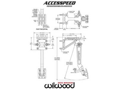 Wilwood adjustable ratio Tru-Bar balance bar brake pedal from Accesspeed is available in a forward swing hanging assembly. Pedal head adjusts vertically to provide a 6.25, 6.63, or 7.00:1 ratio for more feel or less pedal effort. Two brake master cylinders mount to the assembly through the firewall, with a friction-free, trunnion based adjustable Tru-Bar balance bar providing front to rear brake bias fine tuning. The non-skid waffled pedal pad can be laterally adjusted 1/2 inch in either direction for driver preference. The pedal features a lightweight aluminum frame, with high strength reinforced I-beam style forged pedal arm. The Tru-Bar incorporates a positive detent stop every full turn to maintain adjustment position and can be locked in place with the included jam nut, or used with an optional remote knob, which is an Accesspeed favorite for quick on-track adjustments. Tru-Bar pedals utilize a fixed trunnion bearing in the pedal arm, with spherical rod-end bearing pushrod attachments reducing compliance and friction for more accurate brake feel. Tru-Bar pedals utilize the same chassis and master cylinder mounting as Wilwood balance bar style pedals. This pedal accepts any two Wilwood 2.25-inch vertical mount flange single outlet master cylinders, available separately in a variety of styles and bore sizes from Accesspeed.