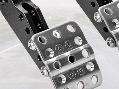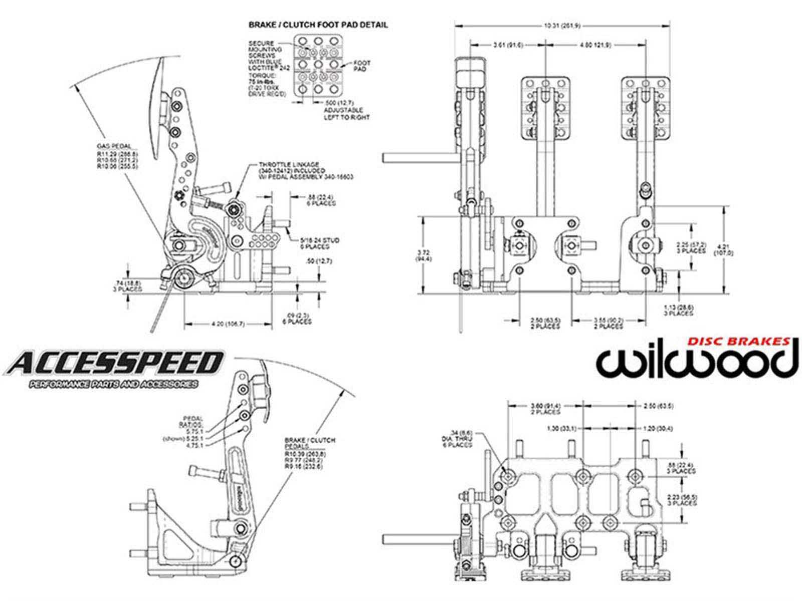 Wilwood adjustable ratio balance bar brake pedal from Accesspeed is available in a floor mount throttle, brake and clutch pedal assembly for rear engine cars. Pedal head adjusts vertically to provide a 4.75, 5.25, or 5.75:1 ratio for more feel or less pedal effort. A clutch and two brake master cylinders mount to the assembly, with an adjustable balance bar providing front to rear brake bias fine tuning. The throttle pedal includes a pull rod for rear engine applications. The non-skid waffled pedal pads can be laterally adjusted to place the clutch and brake from 3.75 to 5.75 inches on center for driver preference. The pedals feature a lightweight aluminum frame, with high strength reinforced I-beam style forged pedal arms. The balance bar incorporates a positive detent stop every full turn to maintain adjustment position and can be locked in place with the included jam nut, or used with an optional remote knob, which is an Accesspeed favorite for quick on-track adjustments. A pin and clevis pushrod attachment system ensures the smallest possible misalignment angle for bind free operation through the entire range of travel. This pedal accepts three Wilwood 2.25-inch vertical mount flange single outlet master cylinders, available separately in a variety of styles and bore sizes from Accesspeed.