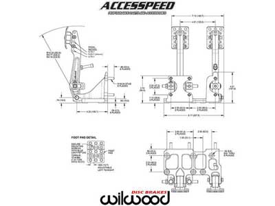 Wilwood adjustable ratio balance bar brake pedal from Accesspeed is available, in a floor mount brake and clutch pedal assembly. Pedal head adjusts vertically to provide a 4.75, 5.25, or 5.75:1 ratio for more feel or less pedal effort. A clutch and two brake master cylinders mount to the assembly, with an adjustable balance bar providing front to rear brake bias fine tuning. The non-skid waffled pedal pads can be laterally adjusted to be from 3.75 to 5.75 inches on center for driver preference. The pedals feature a lightweight aluminum frame, with high strength reinforced I-beam style forged pedal arms. The balance bar incorporates a positive detent stop every full turn to maintain adjustment position and can be locked in place with the included jam nut, or used with an optional remote knob, which is an Accesspeed favorite for quick on-track adjustments. A pin and clevis pushrod attachment system ensures the smallest possible misalignment angle for bind free operation through the entire range of travel. This pedal accepts three Wilwood 2.25-inch vertical mount flange single outlet master cylinders, available separately in a variety of styles and bore sizes from Accesspeed.