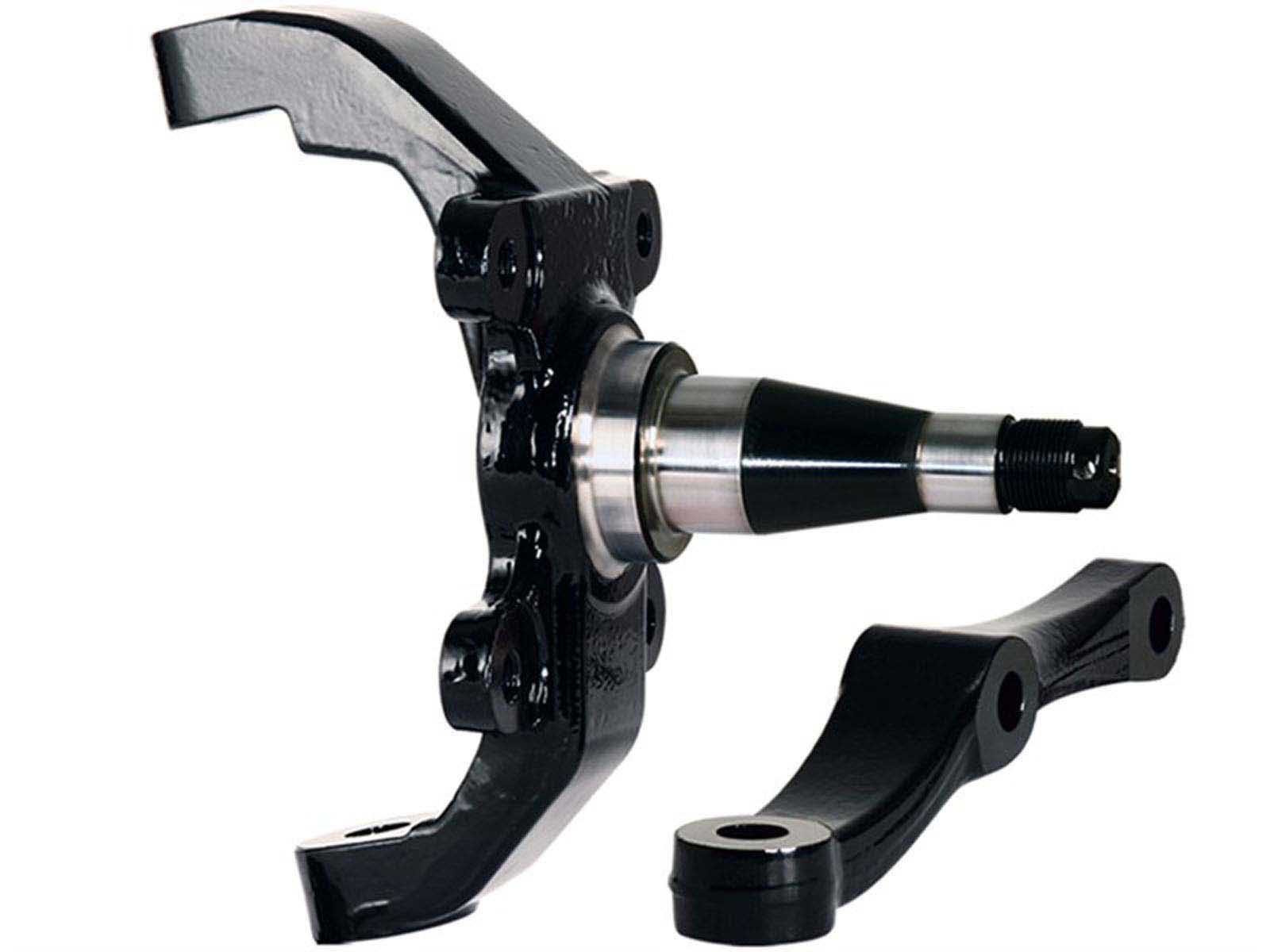 The 2" dropped spindle pin provides the desired lowered ride height without disturbing the suspension geometry. Bolt-on steering arms are strong and can be reversed to accommodate rear steer configurations. They also allow the same spindle to be used on either side of a vehicle. Bolt-on caliper brackets attach to substantially reinforced mounting bosses on the spindle body for secure, deflection-free mounting of four or six piston calipers.