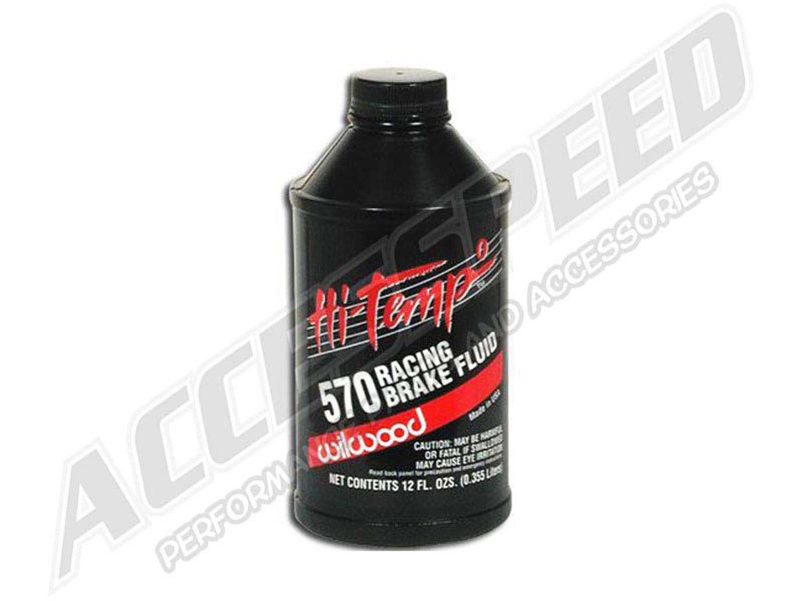 Wilwood’s specially formulated Hi-Temp° 570 Racing Brake Fluid has a minimum 570° F dry boiling point to withstand the severe heat requirements of automotive racing. Hi-Temp° 570’s low viscosity allows easy bleeding of your brake system, eliminating aeration of the brake fluid caused by foaming due to excessive pumping of the pedal. Hi-Temp° 570 comes in convenient 12 ounce containers hermetically sealed to guarantee against unwanted absorption of moisture which can drastically lower the fluids boiling point (fluid from larger containers tends to become contaminated with moisture, lowering its boiling point and making it unsuitable for racing applications).