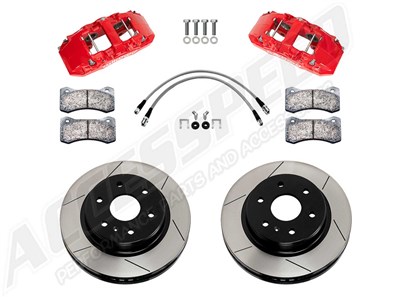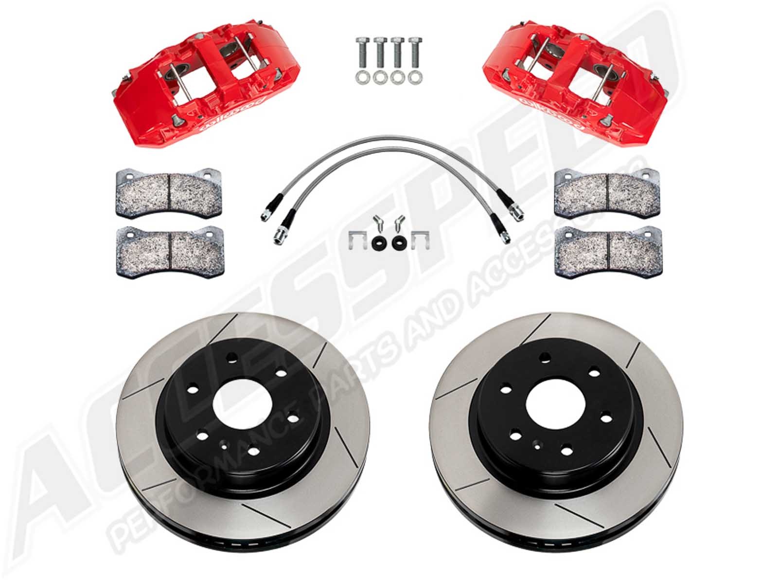 Wilwood’s new AERO4-DM direct-mount caliper brake kits from Accesspeed are designed to fit most factory and aftermarket 17” wheels. Replaces the factory floating calipers with Wilwood’s net-forged aluminum, four piston calipers and premium alloy one-piece rotors. Forged aluminum AERO4-DM four-piston Aerolite direct-mount calipers have been optimized for the spindle to deliver increased clamping force. Rotors are 13.25” x 1.10” premium long-grain iron alloy and substantially increase braking performance when paired with new Wilwood BP “Q” ceramic-based, dual-sport SmartPad brake pads, formulated for everyday street or performance driving. Rotors are GT slotted for strength and performance. Calipers are available in gloss red or black powder coat, and 28 additional colors (additional charges apply).