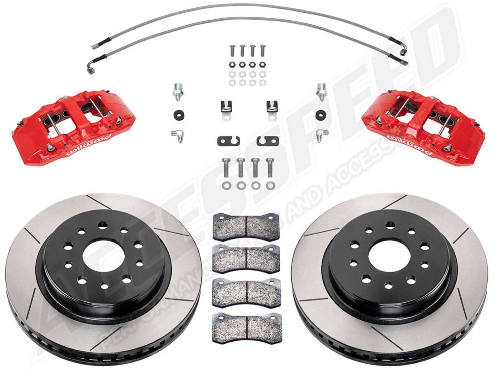 Wilwood’s new AERO6-DM direct-mount caliper front brake kits from Accesspeed are designed to fit most factory and aftermarket 17” wheels. Replace the factory floating calipers with Wilwood’s net-forged aluminum, six piston calipers and premium alloy one-piece rotors. Forged aluminum AERO6-DM six-piston Aerolite direct-mount calipers have been optimized for the spindle to deliver increased clamping force. Rotors are 13.25” x 1.10” premium long-grain iron alloy and substantially increase braking performance when paired with new Wilwood BP “Q” ceramic-based, dual-sport SmartPad brake pads, formulated for everyday street or performance driving. Rotors are GT slotted for strength and performance. Calipers are available in gloss red or black powder coat, and 28 additional colors (additional charges apply).
