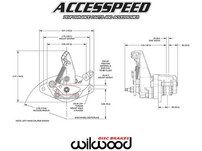 The Wilwood MC5 Mechanical Parking Brake Caliper from Accesspeed is a multi-use, cable operated brake caliper that combines high output performance with simplicity in design and construction and is the perfect solution for vehicle applications requiring a separate, mechanically actuated parking brake caliper. Built to accept rotors that are .250” thick, with 11.00” - 12.88” diameter range, the MC5 combines an efficient die cast body with a forged billet anvil for superior strength under load, yet is lightweight at only 3.30 (2.95 without pads) pounds. Supplied with each caliper are our Composite Metallic (CM) high friction, high static-hold brake pads, and are pre-fitted with noise cancelling shields.
