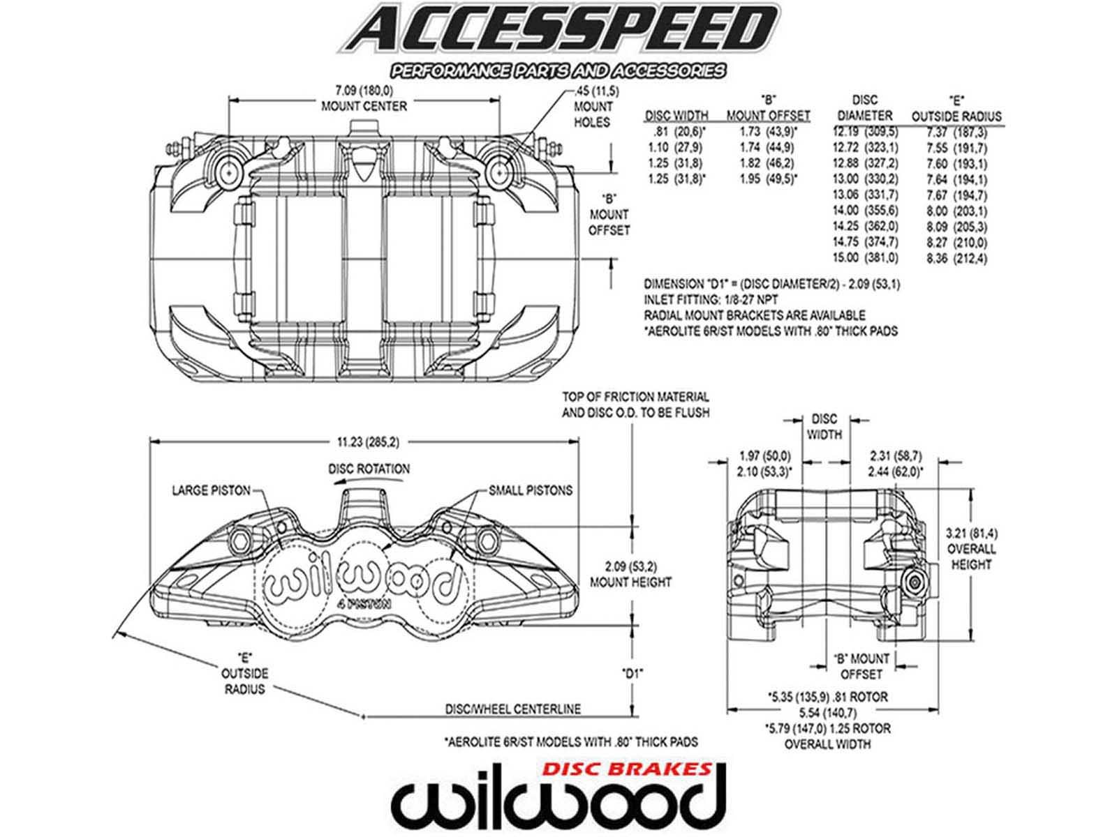 The Wilwood AERO6 forged six-piston caliper from Accesspeed delivers heavy duty stopping power for the road or track. The caliper incorporates race technology into a body design with widespread adaptability. Radial mounting, multiple options for piston volume, and a rotor diameter ranging from 12.88" to 15.00" give this caliper the versatility necessary to suit all types of heavy weight braking requirements. The new AERO is the latest innovation to the W4A / W6A series of calipers. It has been redesigned with internal fluid ports that eliminate the external fluid cross-over tubes and massive center bridge assembly.
