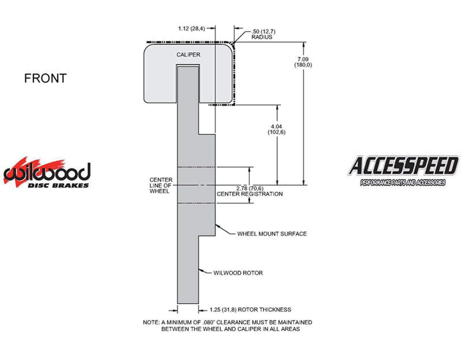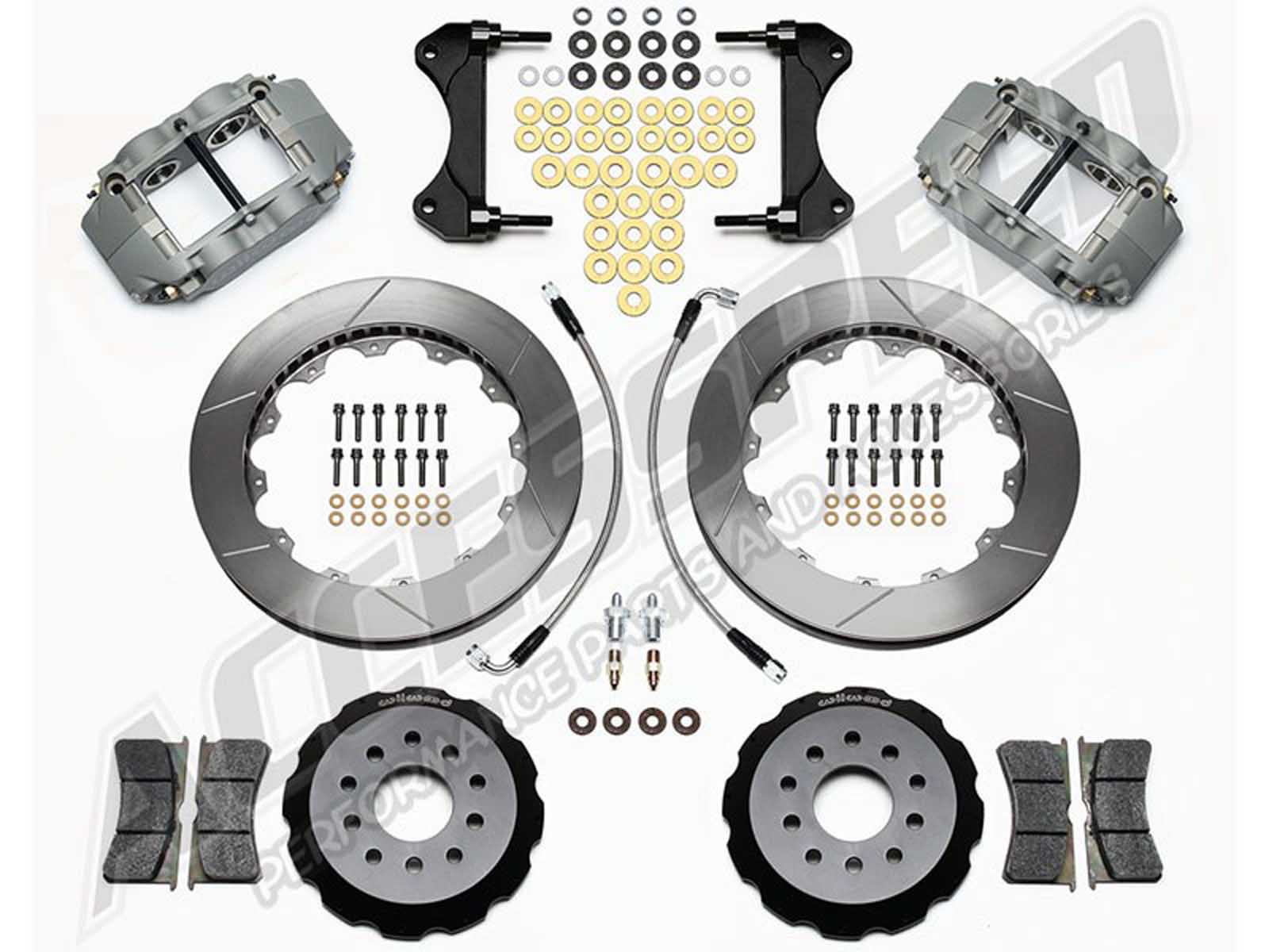 Wilwood Forged Narrow Superlite 4R FSL4R/ST rear big brake kit from Accesspeed uses four-piston calipers that feature a forged aluminum body with a Type III Mil-Spec hard anodized, and medium gray color finish. Hard anodizing provides superior wear resistance in the piston bores, and high resistance to abrasion and corrosion throughout. Thermlock® pistons are used to reduce heat transfer from the pads to increase fade resistance, and to extend service life by decreasing temperatures in the caliper body, fluid, and seals. Internal damper springs and controlled retraction, high-temperature piston seals assure consistent pedal height from start to finish. Caliper piston volumes are matched for full compatibility with the OE power brake booster and master cylinder, and are easily configured with manual brake conversions and balance bar pedals using appropriately sized master cylinders. Spec37 alloy GT competition series 12.19” diameter directional vane rotors provide high cooling efficiency with rugged durability and thermal stability in sustained high heat competition. Unsprung and rotating weight are minimized by using forged aluminum rotor mounting hats for mounting on the factory hubs. Mounting brackets, including all premium grade fasteners, secure the calipers in the stock location, with minor modifications to the spindle for bracket clearance. Details of the required modifications are illustrated on page 4 of assembly instructions. This championship proven system is completed with high temperature, high friction, endurance race compound pads selected specifically by application. Stainless steel braided flexlines are included in each kit to complete the installation.