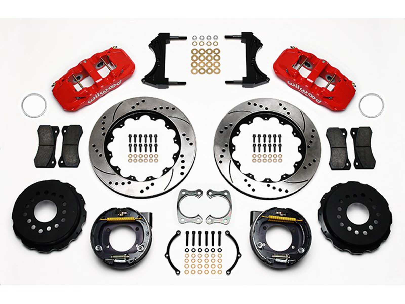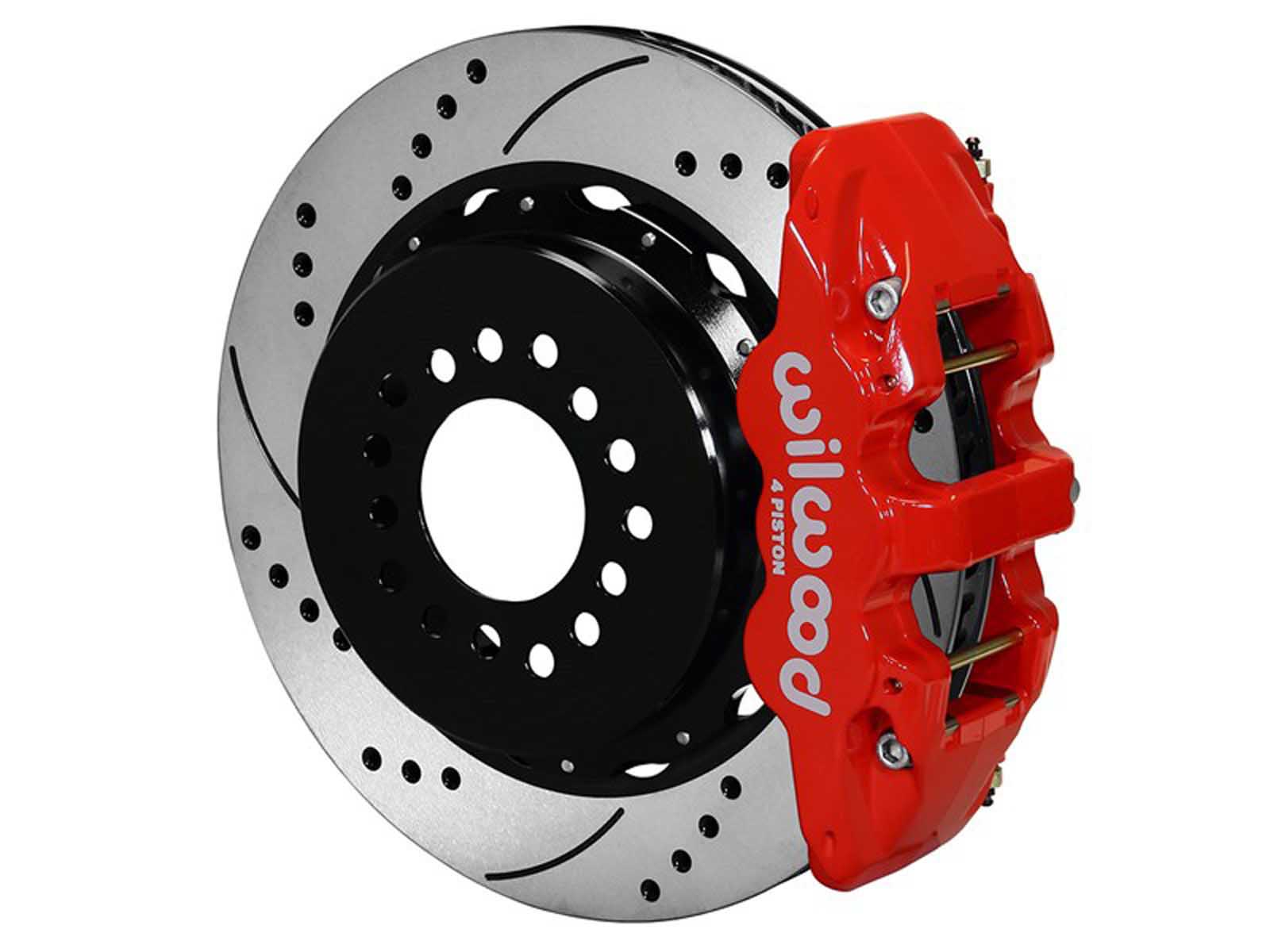 Wilwood 140-10948-DR AERO4 Rear 14" Big Brake Kit With Red Calipers Drilled Rotors & 2.50" Offset for Ford and Mercury With Ford Big Newer-Style Axle Flange