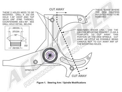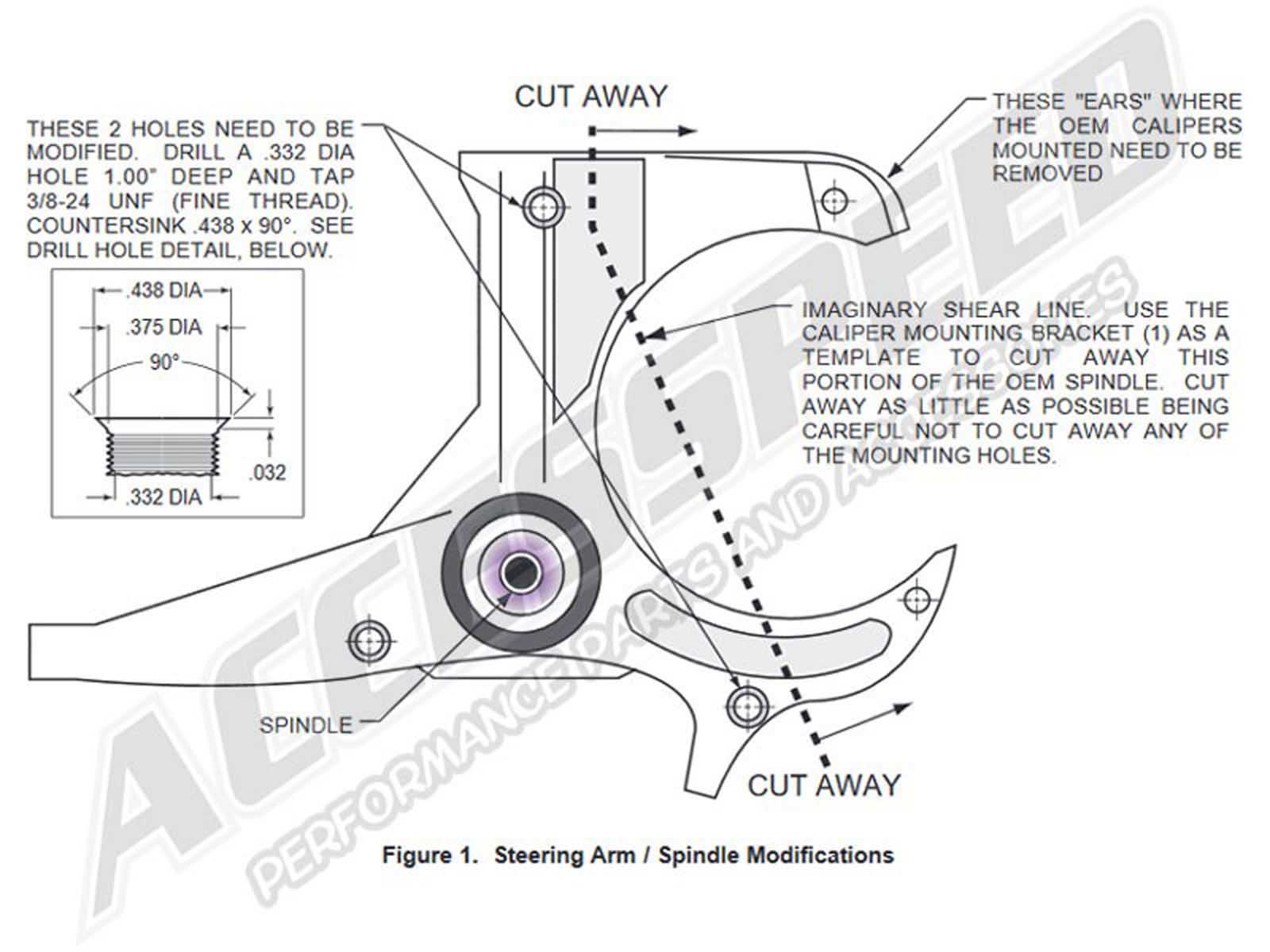 THIS BRAKE KIT MAY REQUIRE SLIGHT MODIFICATION (DRILLING, TRIMMING, ETC.) TO YOUR ORIGINAL SPINDLE.