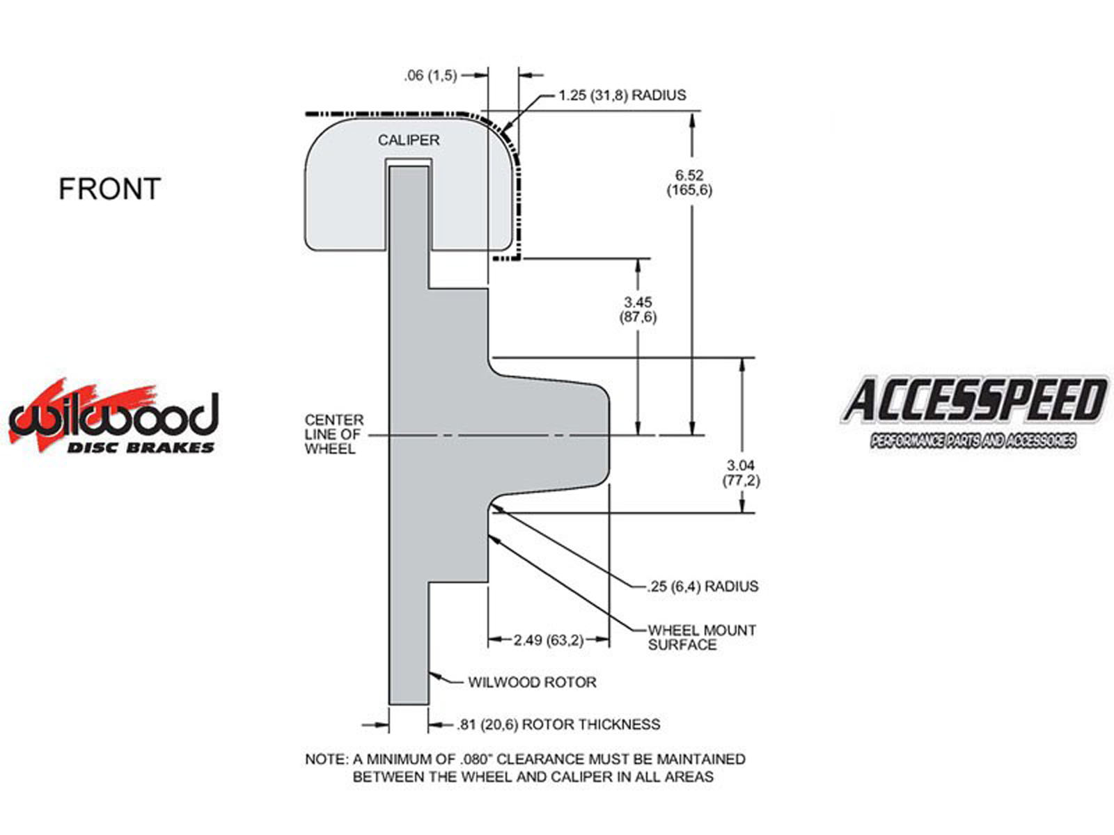 *This Brake Kit may require 14-inch or larger wheels. Please refer to the wheel clearance diagram to check to see if it will fit your specific wheel.  Wilwood hubs in this kit require a larger center hole in wheel than factory hub. Please verify that your wheel has a center hole at least 3.050” in diameter.