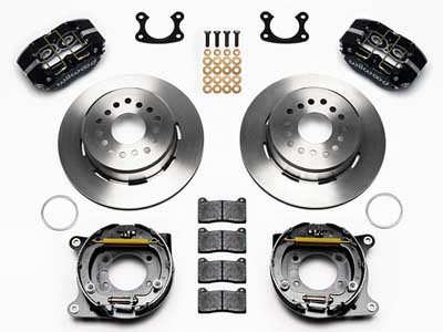 Forged Dynapro Low-Profile Pro-Series rear disc brake kits provide a complete solution for popular muscle car rear axles on applications that require a parking brake assembly and extra clearance for 14” to 15” rim applications. Forged billet Dynapro Low-Profile four-piston calipers 11.00” one-piece hat and rotor assemblies, and high friction pads provide optimized and balanced braking for all types of custom performance street/strip and show machines. The neatly hidden internal shoe system provides a clean installation with superior static holding power for parking. Optional caliper finishes and rotor designs enable the builder to personalize the style and optimize brake performance for every individual application. Requires use of snap ring style Green Bearing. (MO400)