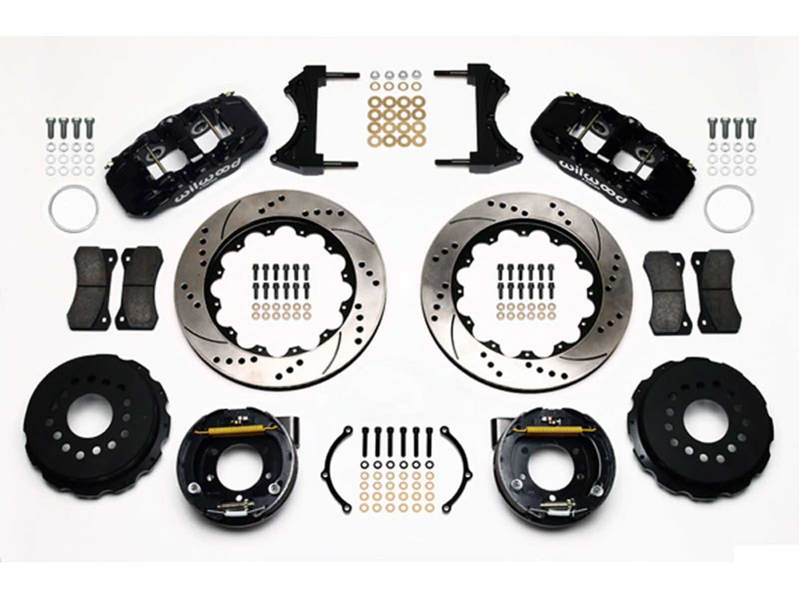 AERO4 Big Brake Rear Axle Kits replace the factory disc brakes and use the OE parking brake assembly as a compliment to front big brake upgrades on late model high performance vehicles. High capacity braking from the W4AR calipers, BP-10 compound pads, and oversized 14.25" rotors are matched to the OE master cylinder output, ABS function, and individual vehicle bias requirements. Enhanced brake performance, increased durability, and high-tech style compliment big wheel, tire, and suspension upgrades on customized vehicles and all others with increased brake requirements.