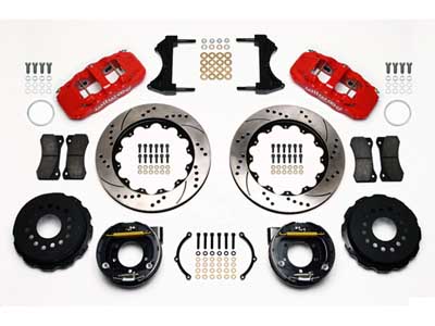 AERO4 Big Brake Rear Axle Kits replace the factory disc brakes and use the OE parking brake assembly as a compliment to front big brake upgrades on late model high performance vehicles. High capacity braking from the W4AR calipers, BP-10 compound pads, and oversized 14.25" rotors are matched to the OE master cylinder output, ABS function, and individual vehicle bias requirements. Enhanced brake performance, increased durability, and high-tech style compliment big wheel, tire, and suspension upgrades on customized vehicles and all others with increased brake requirements.