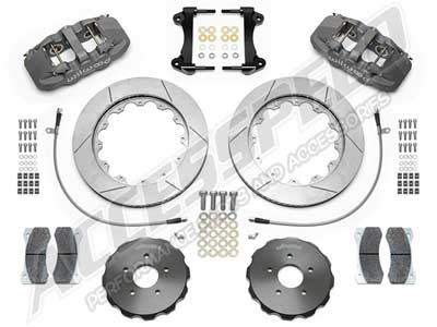This Wilwood Big Brake Kit from Accesspeed is configured for dedicated road racing when 14.00” / 355mm rotors are required by rules or preferred for weight savings. The AERO6R/ST six piston calipers used in this kit feature a forged aluminum body with a Type III Mil-Spec, medium gray color hard anodized finish. Hard anodizing provides superior wear resistance in the piston bores, and high resistance to abrasion and corrosion throughout. This latest model of the AERO6R/ST calipers features a wider than standard body that accepts 20mm thick pads to add volume for longer service life. Thermlock pistons are used to reduce heat transfer from the pads to increase fade resistance, and to extend service life by decreasing temperatures in the caliper body, fluid, and seals. Internal damper springs and controlled retraction, high-temperature piston seals assure consistent pedal height from start to finish. Caliper piston volumes are matched for full compatibility with the OE master cylinder output and ABS controls. The calipers are also fully compatible with manual brake conversions to balance bar pedals using appropriately sized master cylinders. Spec37 alloy GT series 14.00” diameter directional vane rotors are dynamically mounted to the OE hubs with weight saving forged aluminum hats. As is with the calipers, the hats are hard anodized for superior wear resistance and extended service life at the load bearing surfaces. Mounting brackets, including all premium grade fasteners, secure the calipers to the spindles in the stock location with no modifications required. This championship proven system is completed with high temperature, high friction, race compound pads selected specifically by application. Brake Kit does not include flex lines.