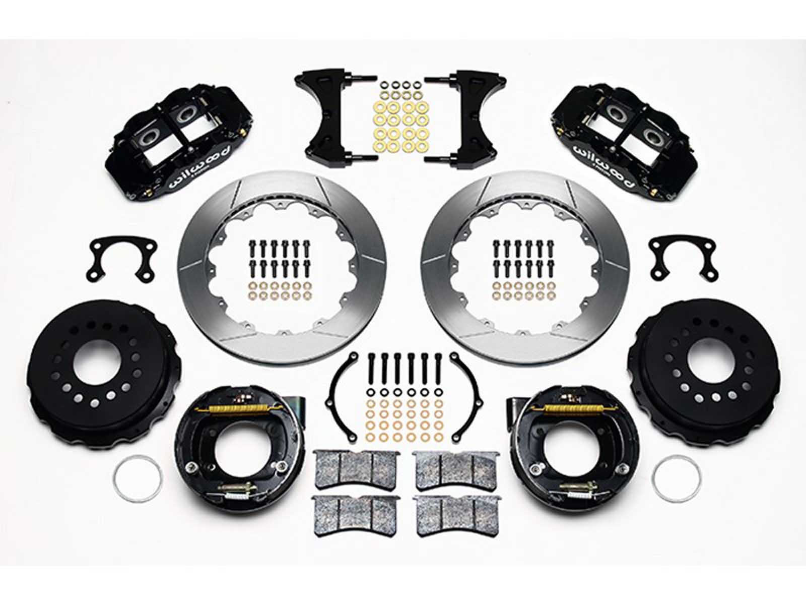 Forged Narrow Superlite 4R rear disc kits provide the ultimate Big Brake solution for popular muscle car rear axles that require a parking brake. FNSL4R four piston calipers, 14” two-piece rotors, and high performance BP-10 compound pads provide optimized and balanced braking to compliment front big brake upgrades on all types of custom, show and high performance street machines. The neatly hidden internal shoe system provides a clean installation with superior static holding power for parking. Requires use of snap ring style Green Bearing. (MO400)