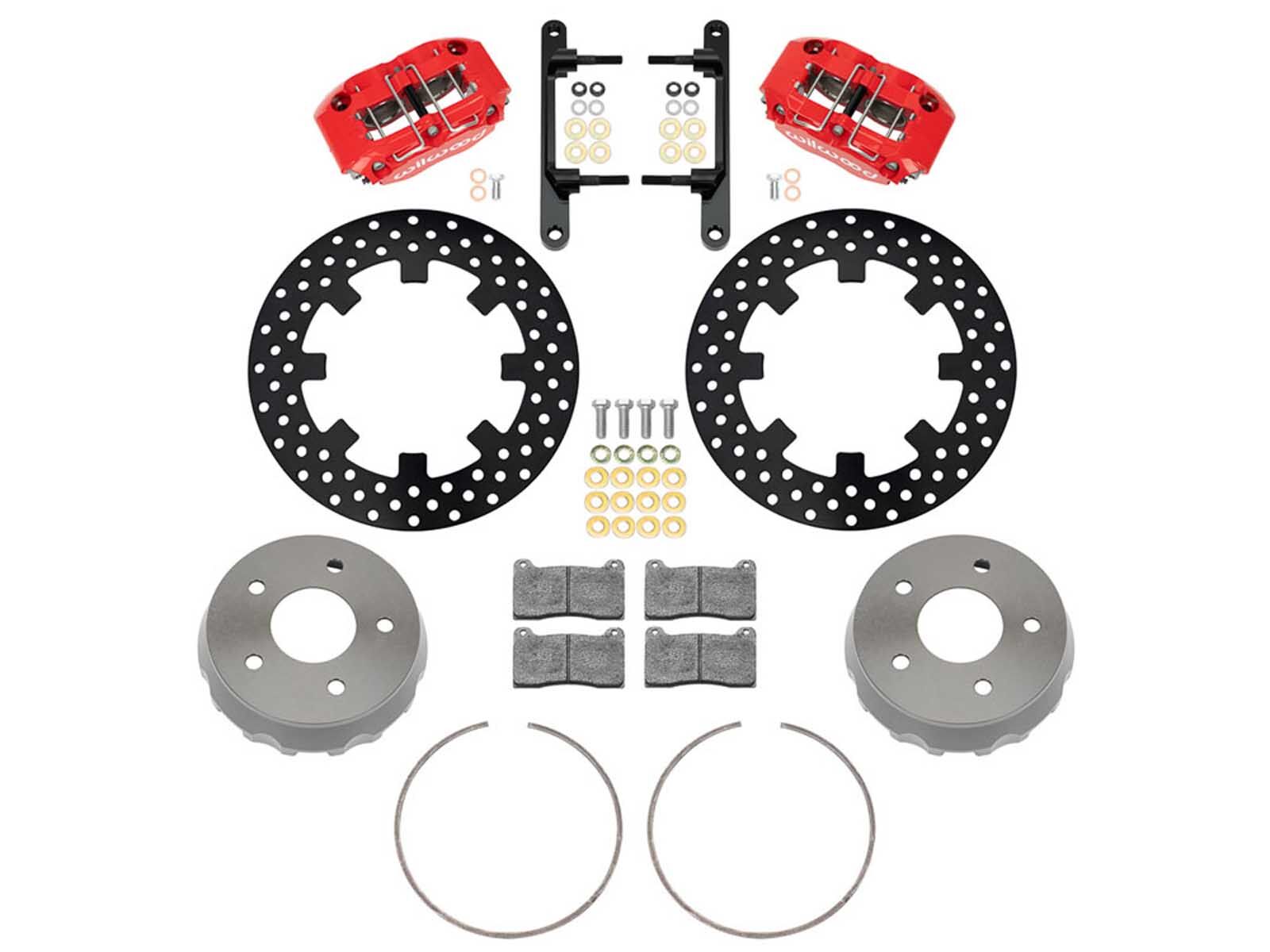 Large 11.25” (285mm) steel rotors improve thermal capacity, are black E-coated and are available with a plain face or drilled options. Calipers are available in glossy red or black powder coat or 24 additional color options (additional charges apply). Wilwood’s high-performance BP-10 SmartPads come standard, while race-spec kits feature BP-28 pads and calipers finished in Type III hard anodize.