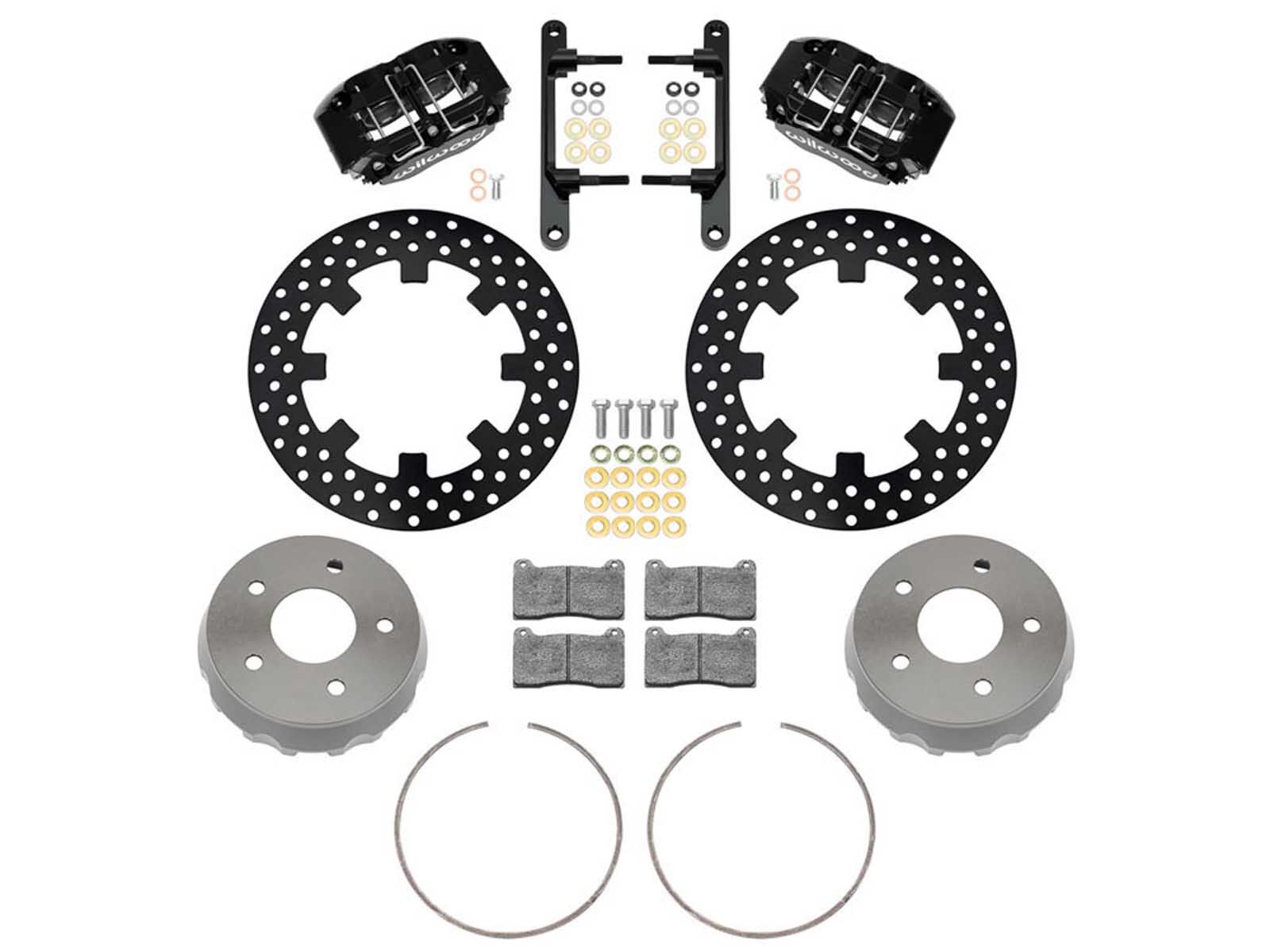 Large 11.25” (285mm) steel rotors improve thermal capacity, are black E-coated and are available with a plain face or drilled options. Calipers are available in glossy red or black powder coat or 24 additional color options (additional charges apply). Wilwood’s high-performance BP-10 SmartPads come standard, while race-spec kits feature BP-28 pads and calipers finished in Type III hard anodize.