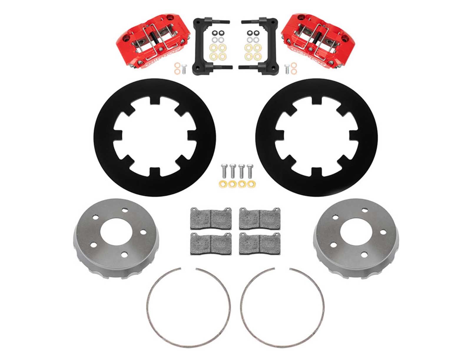 Large 11.25” (285mm) steel rotors improve thermal capacity, are black E-coated and are available with a plain face or drilled options. Calipers are available in glossy red or black powder coat or 24 additional color options (additional charges apply). Wilwood’s high-performance BP-10 SmartPads come standard, while race-spec kits feature BP-28 pads and calipers finished in Type III hard anodize.