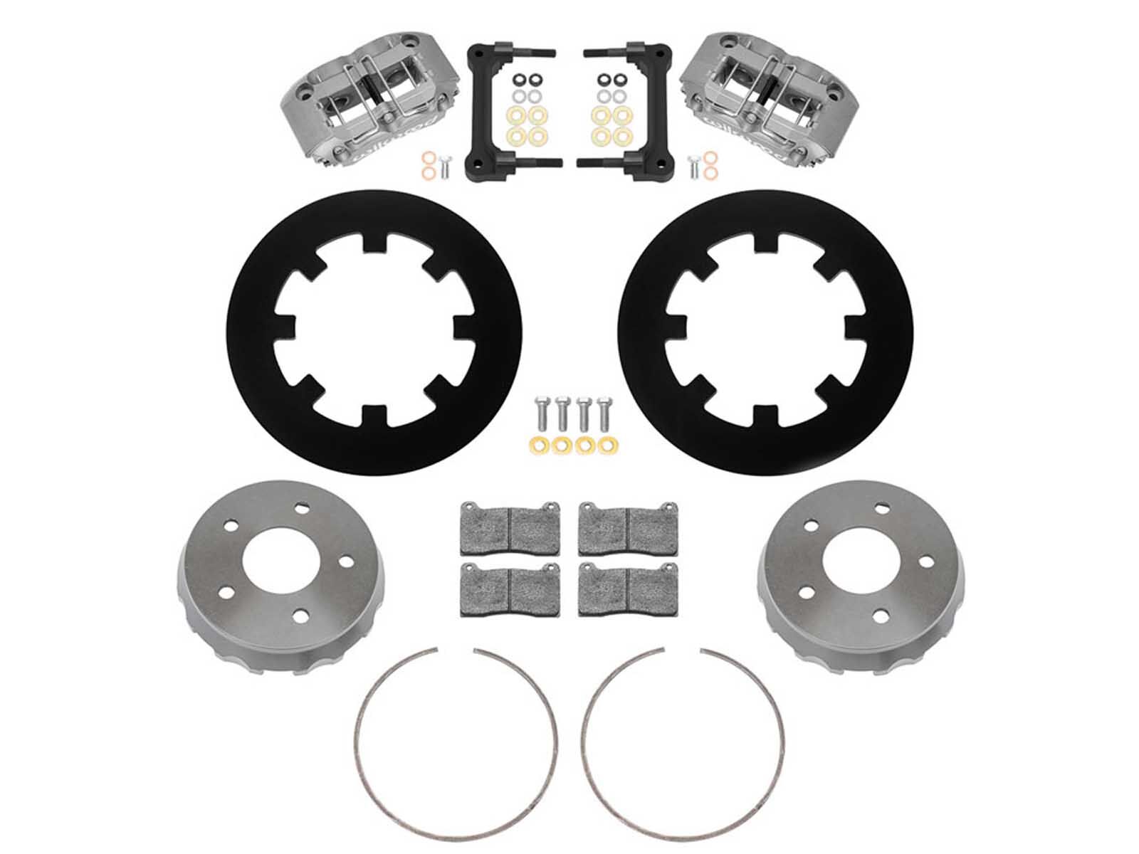 Large 11.25” (285mm) steel rotors improve thermal capacity, are black E-coated and are available with a plain face or drilled options. Calipers are available in glossy red or black powder coat or 24 additional color options (additional charges apply). Wilwood’s high-performance BP-10 SmartPads come standard, while race-spec kits feature BP-28 pads and calipers finished in Type III hard anodize.
