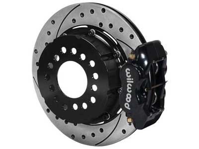 This group of FDL Pro-Series rear disc kits provides a complete solution for popular muscle car rear axles that require a parking brake. Forged billet Dynalite four piston calipers, 12.19” one-piece drum/rotors, and high friction pads provide optimized and balanced braking for all types of custom performance street/strip and show machines. The neatly hidden internal shoe system provides a clean installation with superior static holding power for parking. Optional caliper finishes and rotor designs enable the builder to personalize the style and optimize brake performance for every individual application.