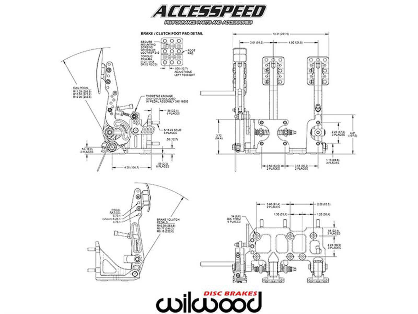 Wilwood adjustable ratio Tru-Bar brake pedal from Accesspeed is available in a floor mount throttle, brake and clutch pedal assembly for rear engine cars. Pedal head adjusts vertically to provide a 4.75, 5.25, or 5.75:1 ratio for more feel or less pedal effort. A clutch and two brake master cylinders mount to the assembly, with a friction-free, trunnion based adjustable Tru-Bar balance bar providing front to rear brake bias fine tuning. The throttle pedal includes a pull rod for rear engine applications. The non-skid waffled pedal pads can be laterally adjusted to place the clutch and brake from 3.75 to 5.75 inches on center for driver preference. The pedals feature a lightweight aluminum frame, with high strength reinforced I-beam style forged pedal arms. The Tru-Bar incorporates a positive detent stop every full turn to maintain adjustment position and can be locked in place with the included jam nut, or used with an optional remote knob, which is an Accesspeed customer favorite for quick on-track adjustments. Tru-Bar pedals utilize a fixed trunnion bearing in the pedal arm, with spherical rod-end bearing pushrod attachments reducing compliance and friction for more accurate brake feel. Tru-Bar pedals utilize the same chassis and master cylinder mounting as Wilwood balance bar style pedals. This pedal accepts three Wilwood 2.25-inch vertical mount flange single outlet master cylinders, available separately in a variety of styles and bore sizes from Accesspeed.