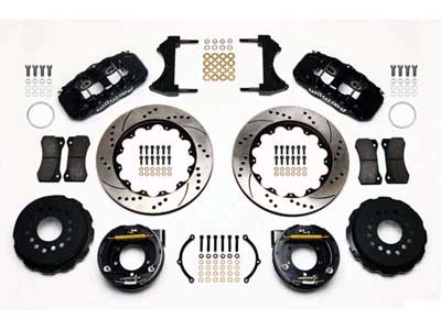AERO4 Big Brake rear axle kits replace the factory disc brakes and use the OE parking brake assembly as a compliment to front big brake upgrades on late model high performance vehicles. High capacity braking from the W4AR calipers, BP-10 compound pads, and oversized 14.25" rotors are matched to the OE master cylinder output, ABS function, and individual vehicle bias requirements. Enhanced brake performance, increased durability, and high-tech style compliment big wheel, tire, and suspension upgrades on customized vehicles and all others with increased brake requirements.