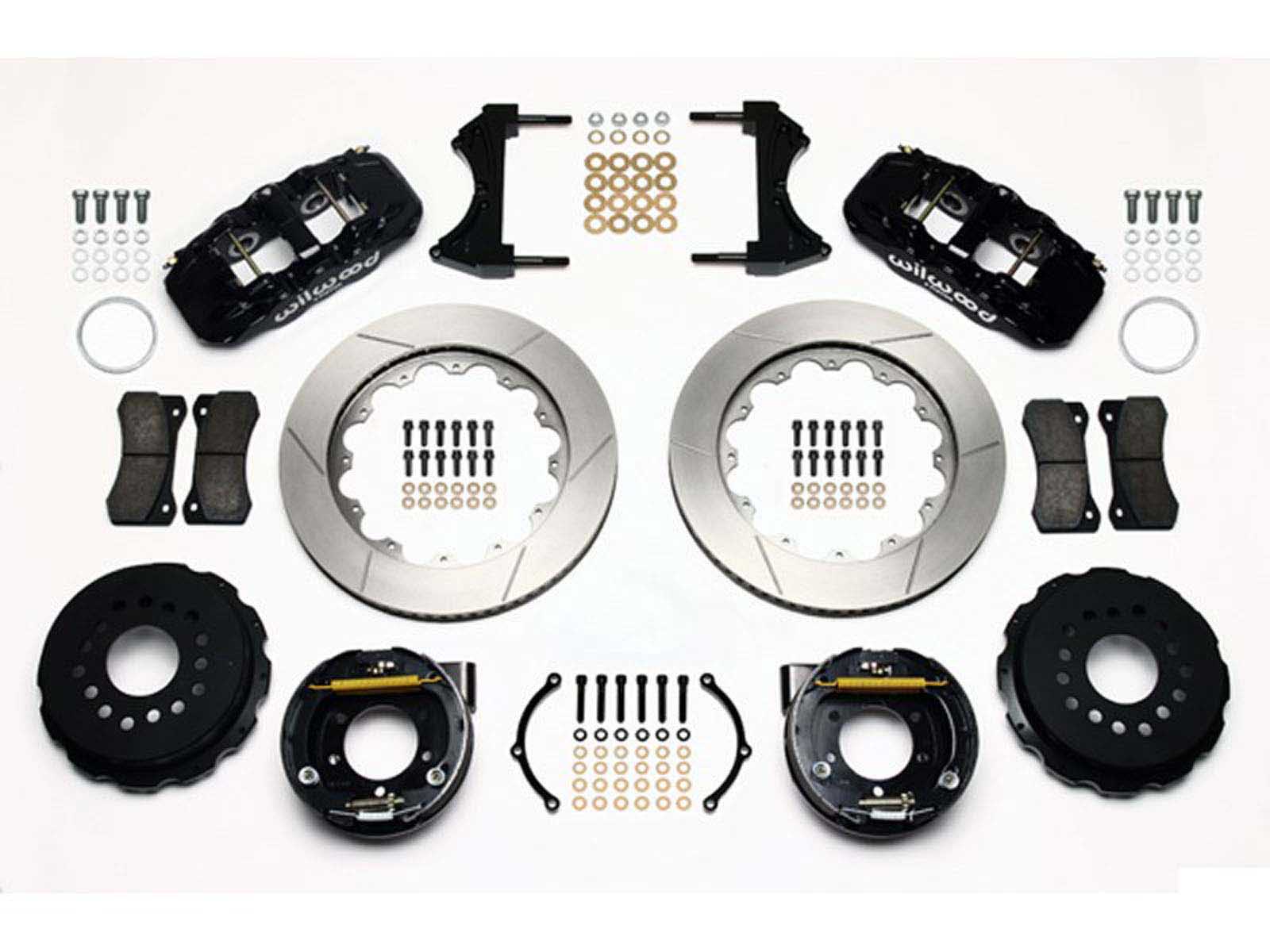 AERO4 Big Brake rear axle kits replace the factory disc brakes and use the OE parking brake assembly as a compliment to front big brake upgrades on late model high performance vehicles. High capacity braking from the W4AR calipers, BP-10 compound pads, and oversized 14.25" rotors are matched to the OE master cylinder output, ABS function, and individual vehicle bias requirements. Enhanced brake performance, increased durability, and high-tech style compliment big wheel, tire, and suspension upgrades on customized vehicles and all others with increased brake requirements.